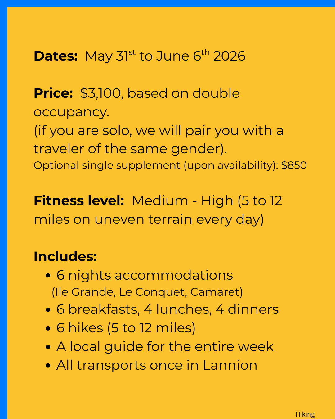Immerse yourself in the vibrant culture of Brittany, guided by a native whose stories and insights bring the region to life. Along the trail, connect with fellow travelers and residents—who share their traditions, language, and ways of living. Each meal becomes a lesson in Breton hospitality, whether you’re savoring crêpes at a family-run café or sharing laughter in a cozy guesthouse. From the tables where you dine to the places you rest, every moment is an invitation to discover the heart of Brittany through those who call it home.