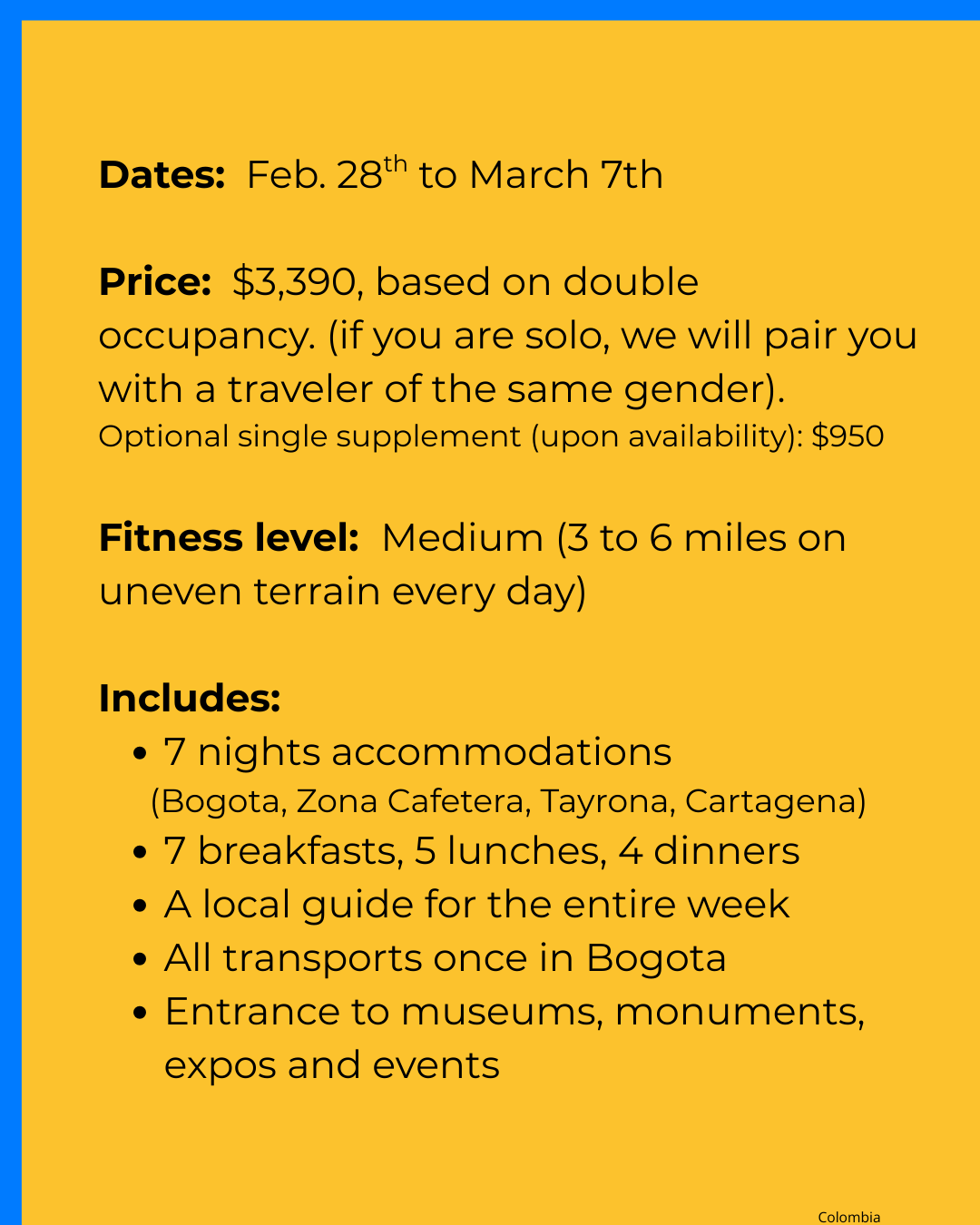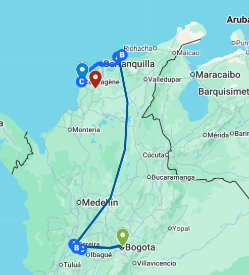 The tour starts in Bogota (El Dorado International Airport) and finishes in Cartagena.